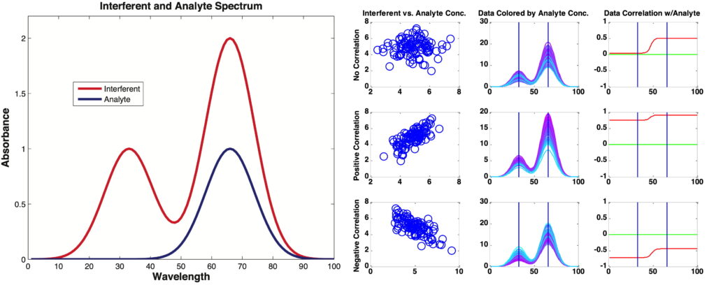 We teach this in our Variable Selection course, and it demonstrates one of the reasons that variable selection is so difficult. You can’t just pick variables that are correlated with the analyte of interest. The figure below shows on the left the spectra of a system where the analyte of interest is entirely overlapped by an interferent, (which is not at all uncommon in NIR!). On the right it is shown that, depending on the degree of correlation between the interferent and the analyte, the correlation between wavelengths and analyte can be positive, negative or zero. More complex systems can produce even more unintuitive behavior, such as instances where the variables most correlated to the analyte of interest have no signal from it all.