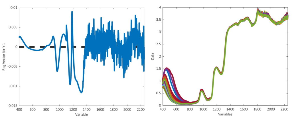 I am writing a report for a university course on advanced chemometrics. I have built a PLS prediction model predicting Real Extract in beer (40 samples) from the attached VISNIR spectra (spectra.jpg) and yielding the regression vector in regressionvector.jpg. I am asked to critically describe what I learn from the regression vector