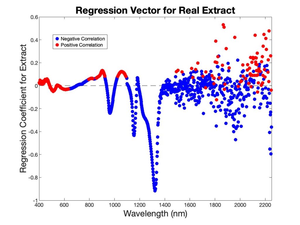 This not correct in general, and not correct in this instance either, although it is closer in this case than usual. The regression vector for this example is shown below, with coefficients colored blue for negative correlation between Real Extract and absorbance at that wavelength and red for positive correlation. You can see that the negative coefficients tend to be blue, and the positive ones tend to be red, but there are plenty of instances of the reverse of this.